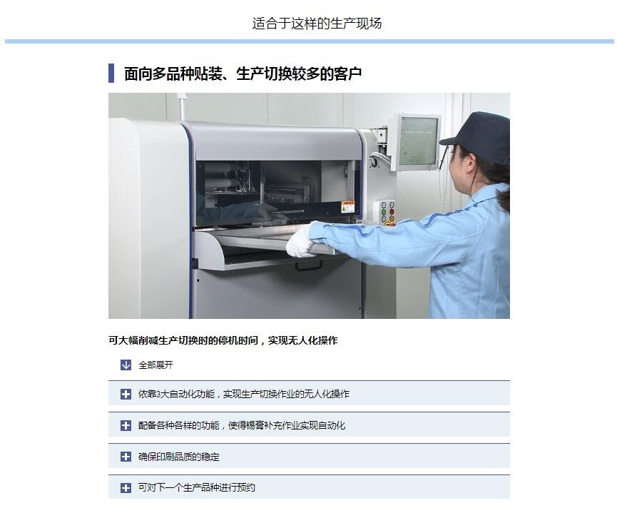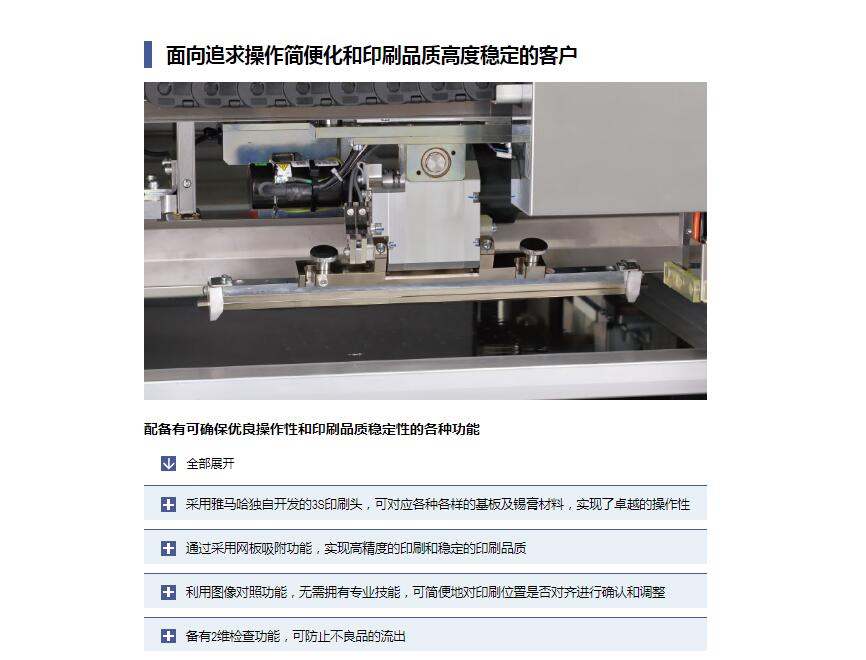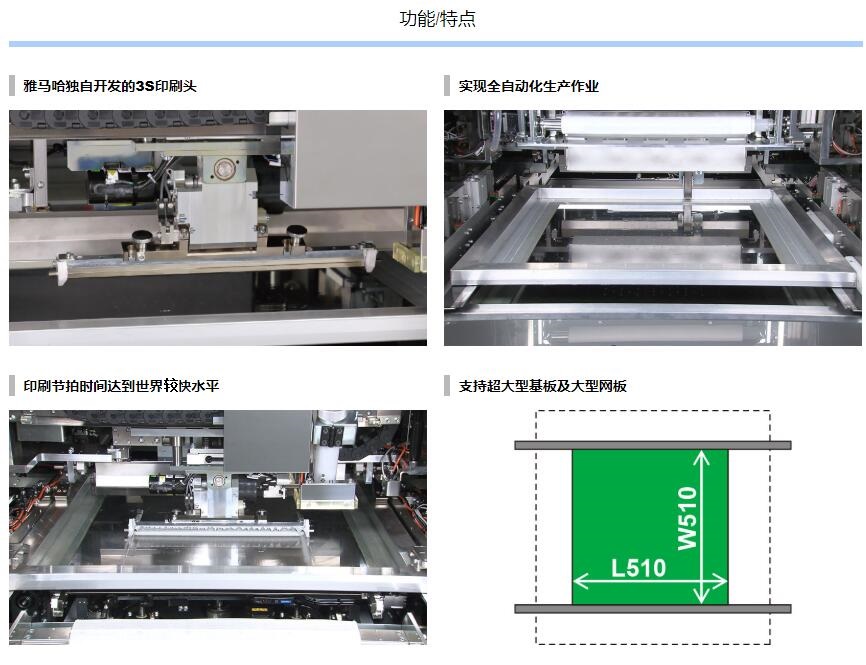 YSP10 高端印刷機1.印刷節拍時間達到世界更快水平,實現全自動化生產作業。2.超高速印刷性能 包括網板清潔作業:12sec/cycle / 10sec/cycle3.重復定位精度:6σ : ±0.01mm4.支持大型基板:L510 x W510mm [選購品: L650 x W510mm]5.網板尺寸:MAX.750×750mm